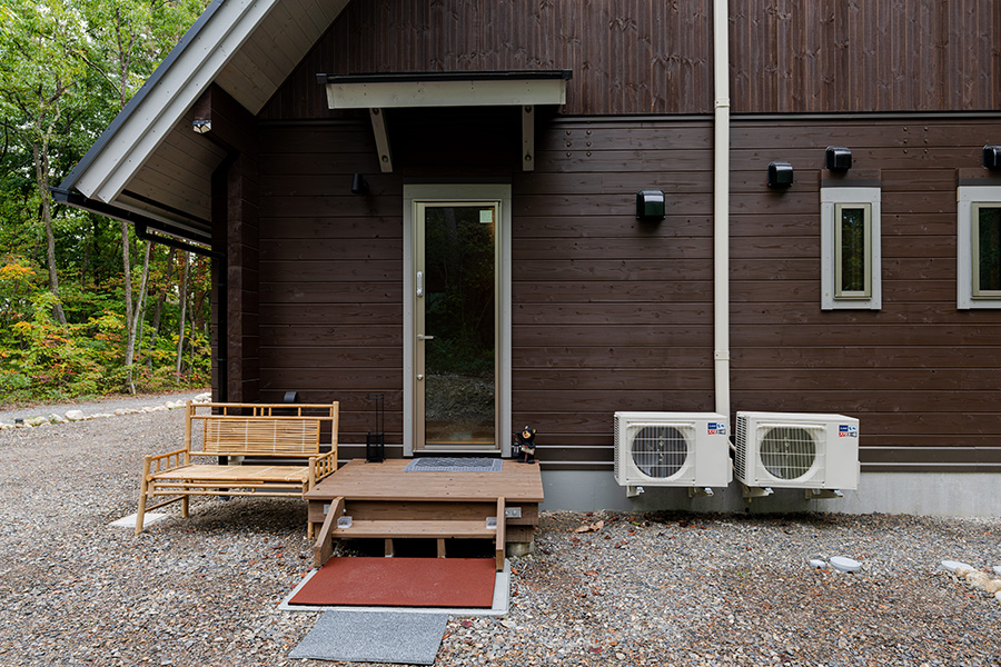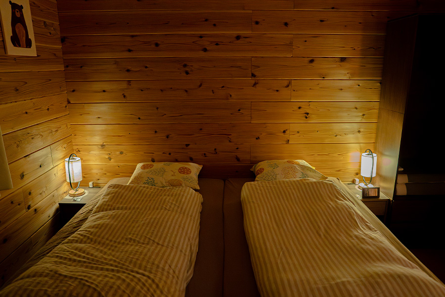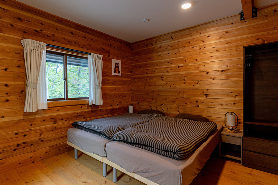 安曇野の森に囲まれた新築ログハウスのプライベート客室。 専用入口と水回り完備、木の温もりに包まれた静かな時間を。