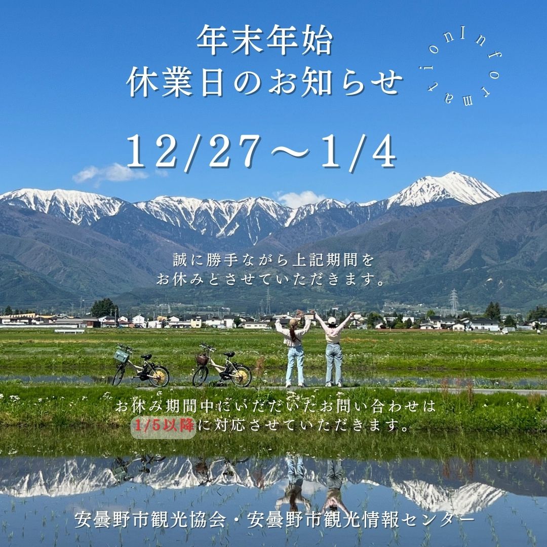 誠に勝手ながら、安曇野市観光協会では下記の期間を年末年始休業とさせていただきます。