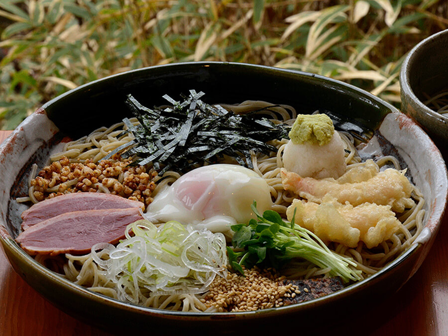 安曇野産・北海道産・茨城県産のそば粉を独自にブレンドした風味豊かなそばをご堪能ください。 薬味に地元産わさびの花芽を使ったわさびの花芽ざるがおすすめです。
