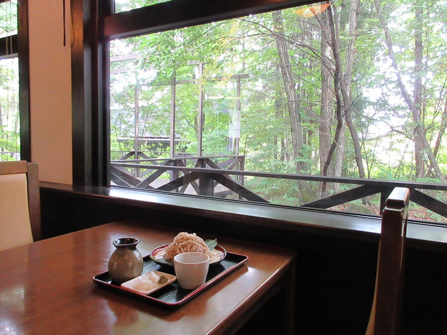 碌山美術館の前にあるそば屋。名水百選の冷たい水で打った、そばを楽しめる。「おそば大好き」という方にはボリュームたっぷりの大ざるそばがおすすめ。