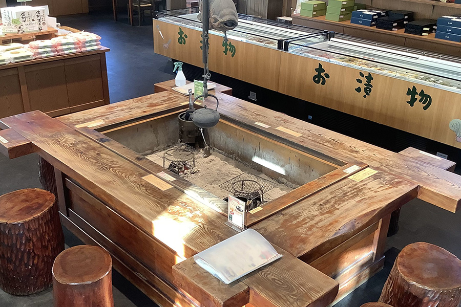 信州の郷土食おやきを始めとし、漬物、信州そば、地酒など信州の味を多数取り扱っており、全国発送も承ります。 店内の囲炉裏では、おやきを焼いて召し上がる事もできます。