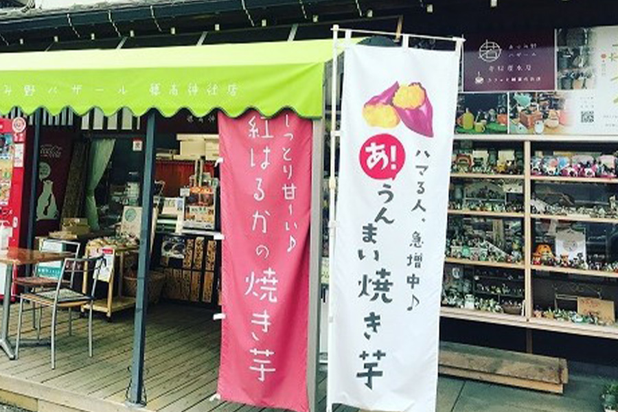 穂高に来たなら穂高神社で日頃の感謝と願かけて。あ!うんまい安納芋焼き芋。自家焙煎珈琲、天然酵母パン。季節のジェラート。本店は若松屋。鳥居をくぐって緑のテントが目印です。