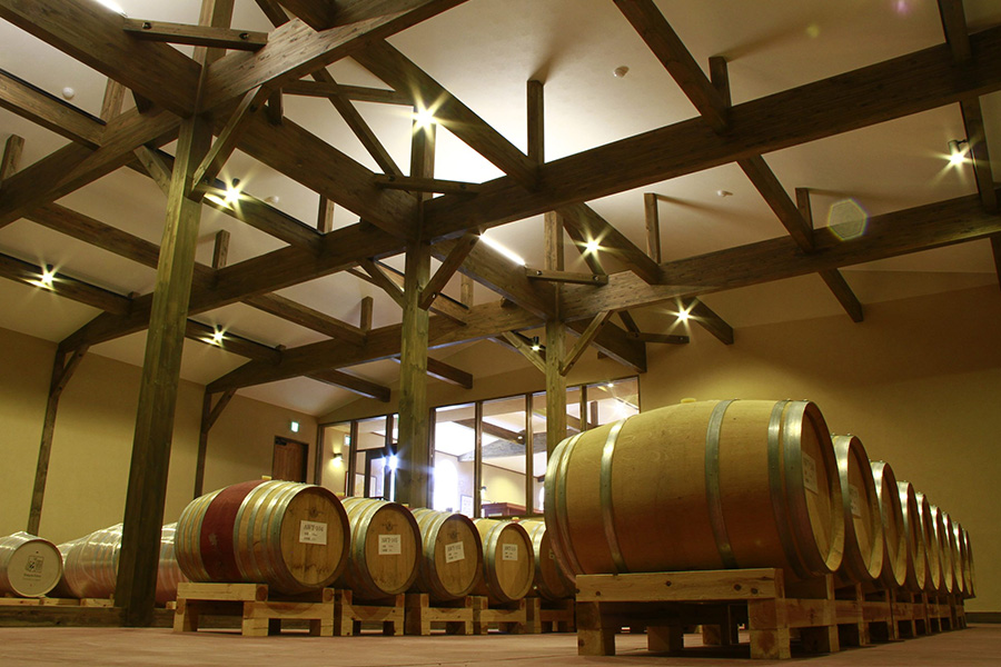 一面のブドウ畑を眺めながら、長野県産ワインや濃厚な『安曇野のむヨーグルト』をご試飲いただけます。 ブドウ畑の散策や木樽の並ぶワインセラーも是非ご覧ください。