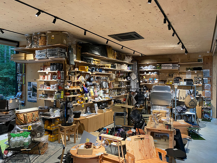 アウトドア用品を中心に、雑貨・古道具などのアイテムが揃います。 また、いつでも体験できる焚火や週末開催のワークショップなど、気軽に自然と触れ合える場でもあります。