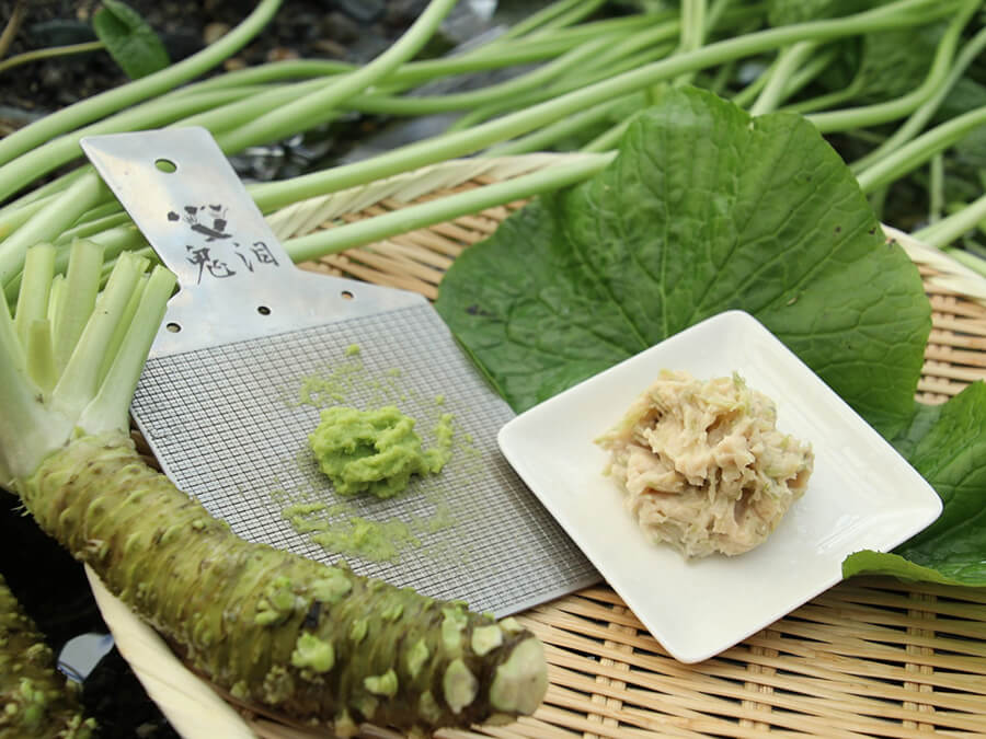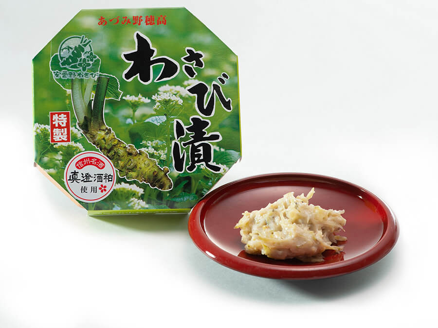 自社農園で収穫した生わさび、自社工場製造のわさび漬、加工食品を取り扱っています。使用する原料も自社原料です。熟成した酒粕を使用したわさび漬がおすすめの一品です。