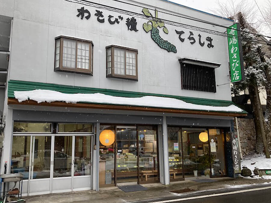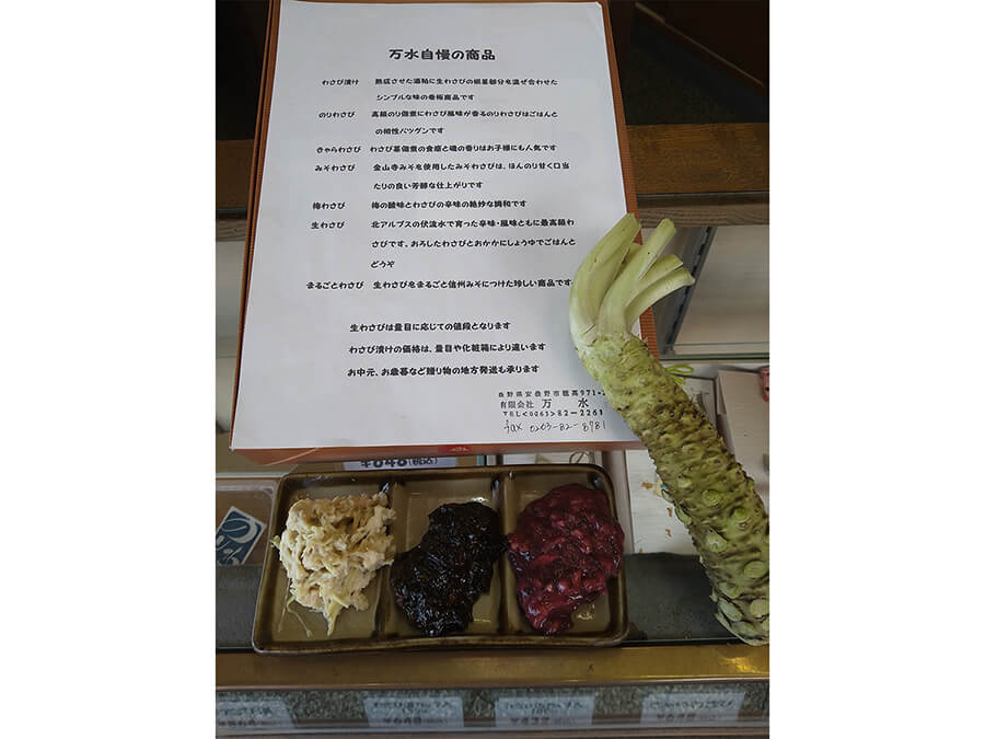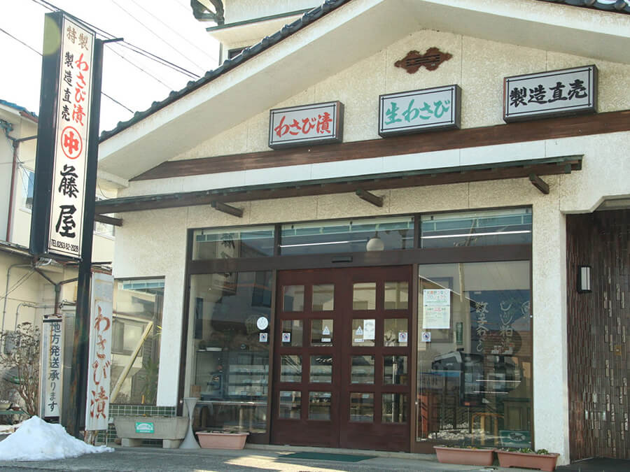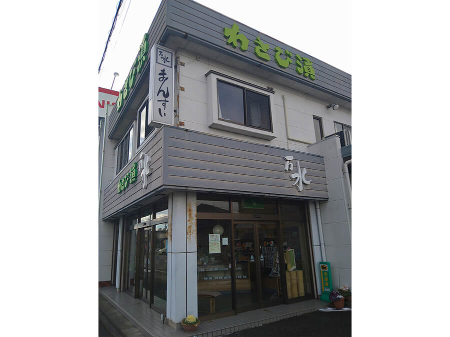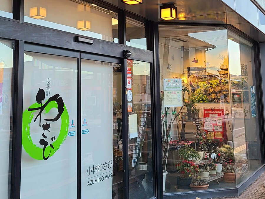 国道147号線沿いの柏矢町に店舗を構えています。生わさび、のりわさび、梅わさび、みそわさび、きゃらわさび、葉わさび醬油漬けは当店の主力商品です。