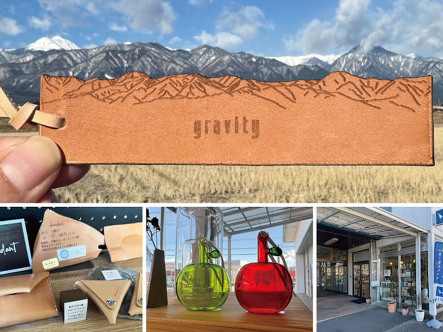 安曇野観光の記念や贈り物に。 県内外の作家さんが丹精込めて作ったアクセサリー・器・オブジェ・布小物・ラグ等や、メーカーさんから仕入れた雑貨などを取り揃えております。 革小物にイニシャルやイラストを刻印してオリジナルアイテムが作れるサービス等も承っております。